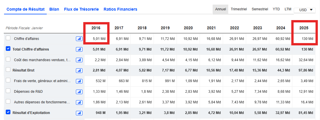 Entre son introduction en Bourse (prix ajusté autour de 0,12 $) et son cours actuel autour de 224 $, l’action a été multipliée par plus de 1 800 fois.
