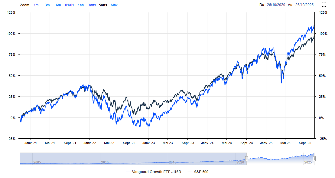 Performance des valeurs de croissance (Vanguard Growth ETF) vs S&P 500 sur 5 ans