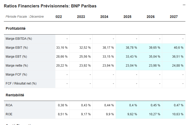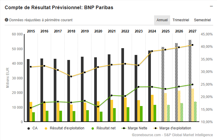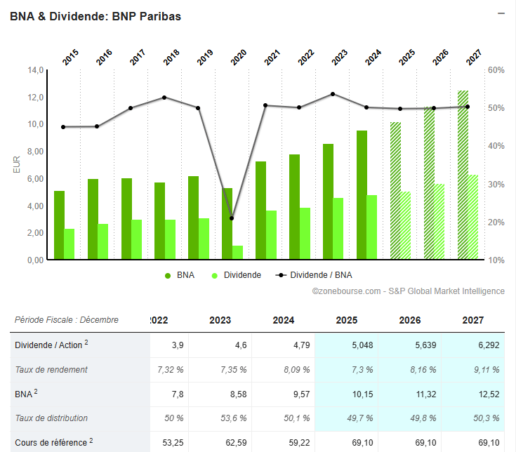 Résultat net : estimé à environ 10 milliards € en 2024, avec une trajectoire ascendante jusqu’à 12,5 milliards € en 2027 selon les projections Zonebourse/S&P Global.
