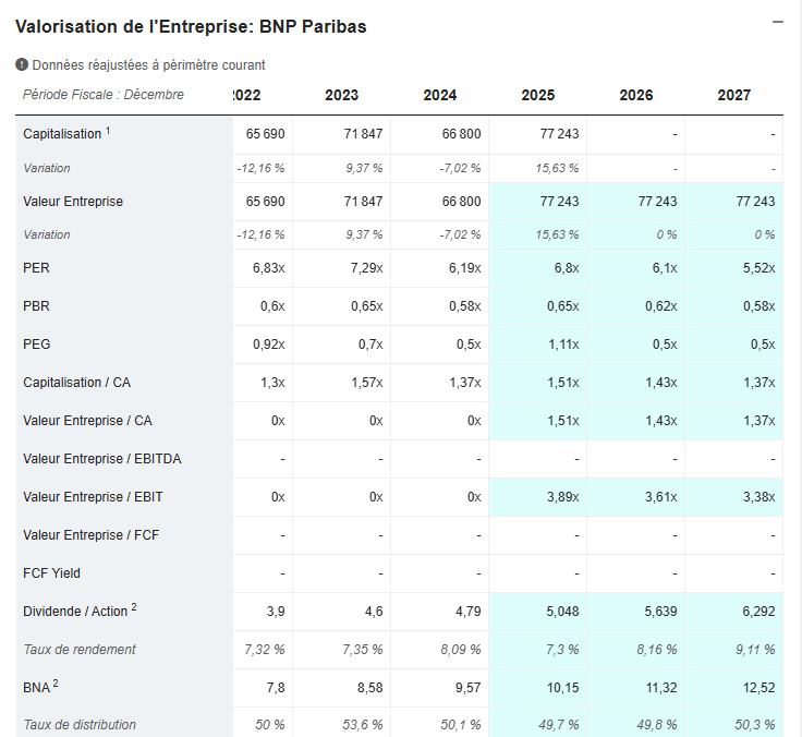 Son Price-to-Book (PBR), à 0,58x, signifie que le marché valorise BNP à à peine la moitié de ses fonds propres — un niveau qu’on retrouve plutôt chez des établissements en restructuration.