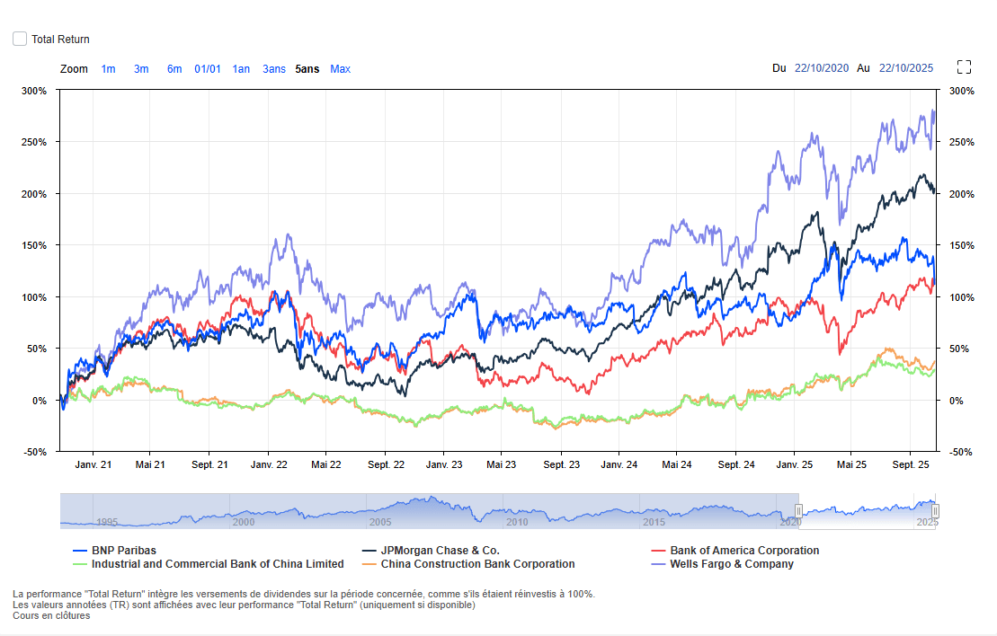 Sur 5 ans, BNP Paribas affiche une performance totale solide, en hausse d’environ +140 %, ce qui la place parmi les meilleures grandes banques internationales.