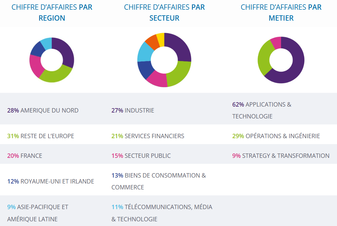 Par secteur d’activité, l’industrie arrive en tête avec 27 % du chiffre d’affaires, suivie par les services financiers (21 %) et le secteur public (15 %). Les biens de consommation et le commerce représentent 13 %, tandis que les télécommunications, médias et technologies complètent le tableau avec 11 %.