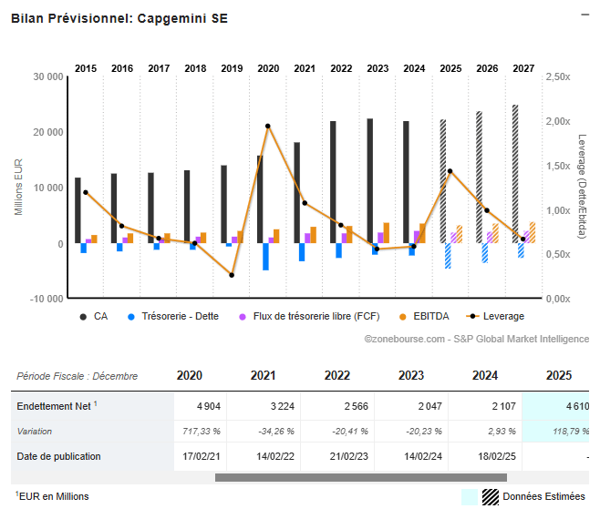 L’endettement net est projeté en hausse à 4,6 Mds€ en 2025 (contre 2,1 Mds€ en 2024), conséquence probable d’acquisitions et d’investissements accrus dans l’IA et le cloud.