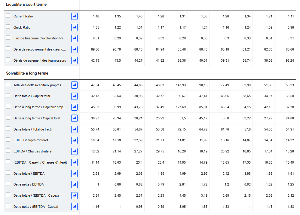 Malgré cette hausse ponctuelle, le levier financier reste très bas, à environ 1x l’EBITDA, bien en deçà des seuils d’alerte.