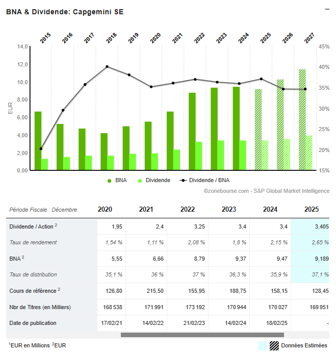 Capgemini privilégie la stabilité et la progression régulière à une distribution excessive : le taux de distribution reste maîtrisé, autour de 35 à 37 % du bénéfice net, ce qui assure la pérennité du dividende même en cas de ralentissement conjoncturel.