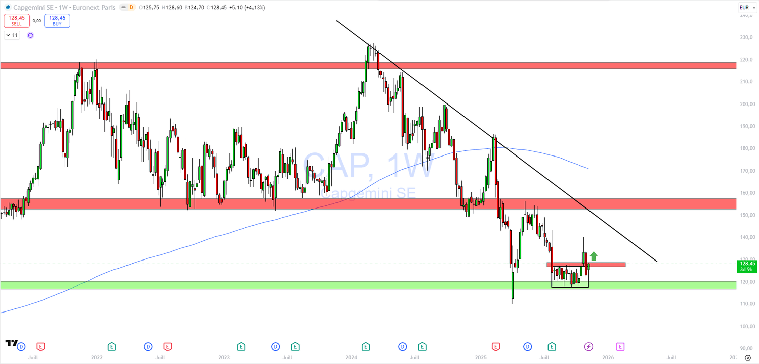 Après plusieurs mois de consolidation dans un range étroit entre 120 € et 130 €, Capgemini tente un rebond technique appuyé sur sa zone de support majeure à 115 € – 120 €, ancienne résistance pré-covid.