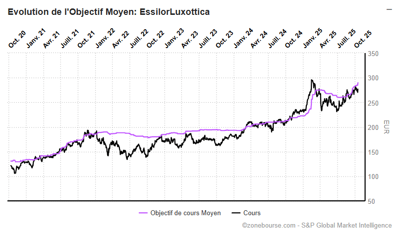 Objectif moyen : 289,6 €, soit un potentiel de +4,7 % par rapport au cours actuel (~276 € au moment du consensus)