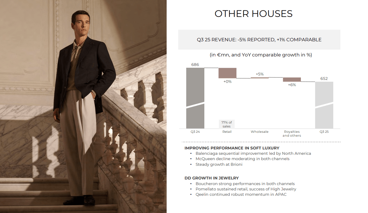 Les autres maisons (Balenciaga, Alexander McQueen, Brioni, Boucheron, Pomellato, Qeelin…) affichent une croissance modeste de +1 % à taux constants.