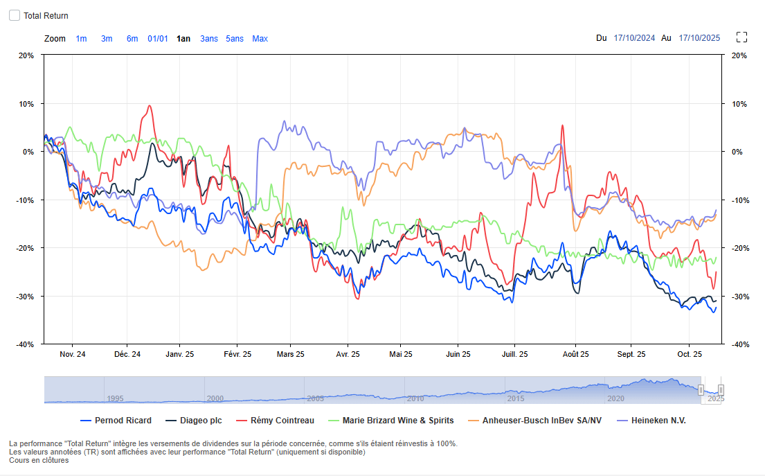 Comparaison avec les concurrents : tout le marché est en difficulté, mais c'est bien Pernod Ricard qui réalise sur un an la moins bonne performance. Opportunité ?
