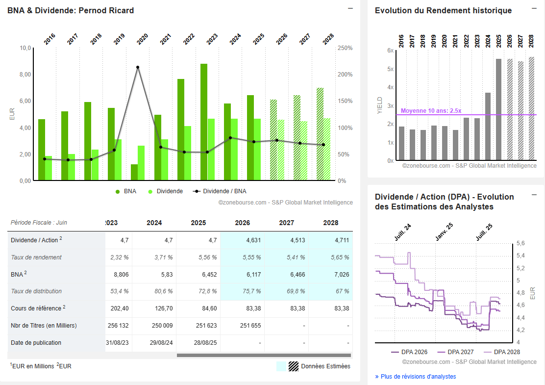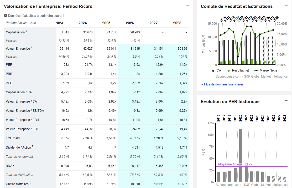 Pernod Ricard entre dans une zone clé : valorisation redevenue attractive, rendement élevé, et base financiÚre solide.