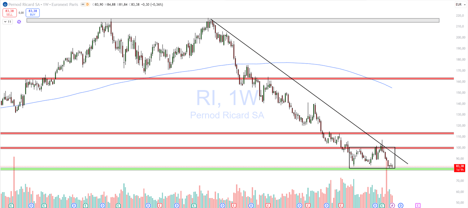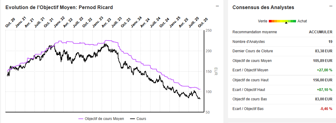 Graphiquement, Pernod Ricard est dans une tendance baissiÚre bien établie, mais les signaux de stabilisation se multiplient.