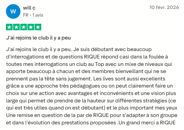 Les formations et les vidéos expliquent souvent la théorie, sans vous dire quoi faire concrètement dans votre situation réelle. Le RIQUE BOURSE CLUB n’est pas un cours de bourse, c’est un accompagnement opérationnel. Vous ne venez pas apprendre des concepts abstraits, vous venez investir avec un système éprouvé, des décisions guidées, des lives interactifs et un suivi continu. C’est cette différence qui permet enfin de passer de l’intention à l’action, sereinement.