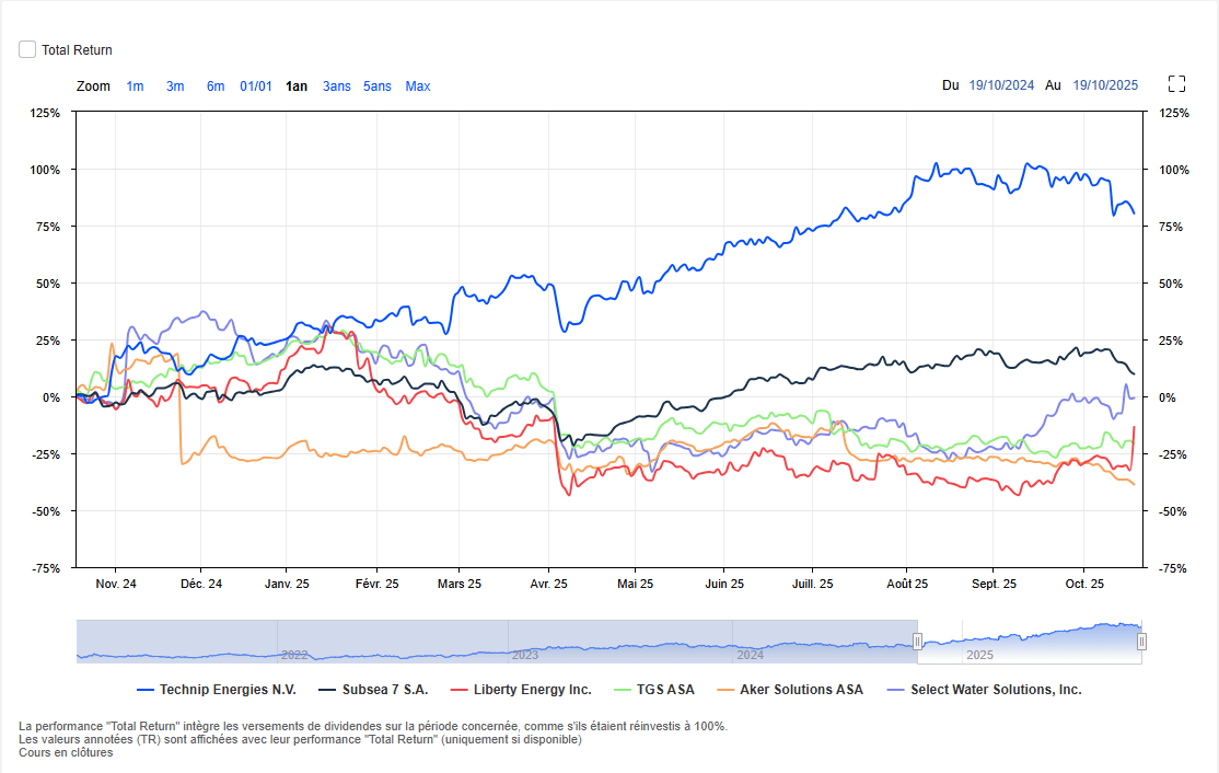Sur un an, le titre a progressé de près de +90 %, surclassant largement ses pairs comme Subsea 7, Aker Solutions ou Liberty Energy.
