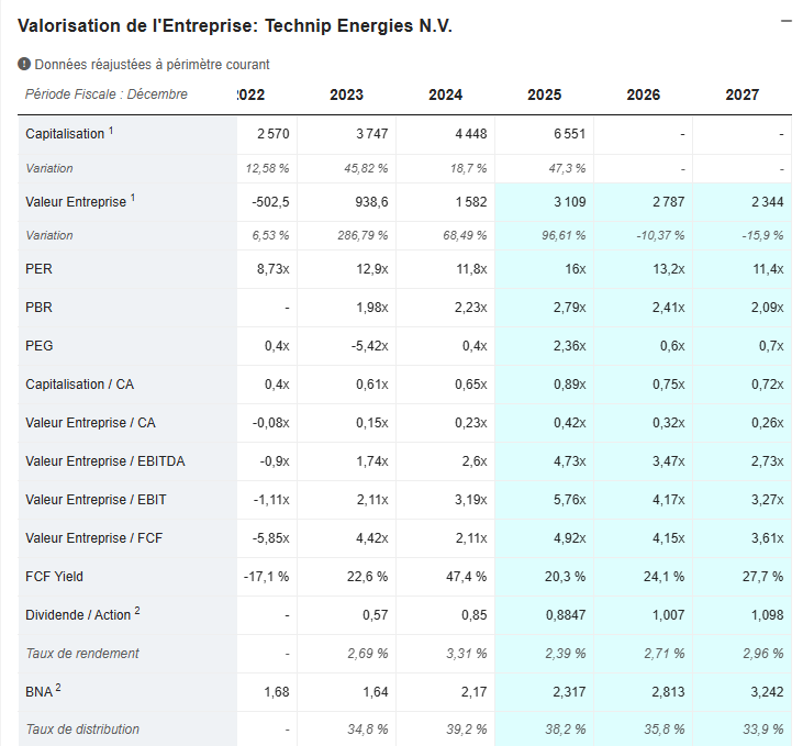 La progression du titre ces derniers mois pourrait laisser croire à une valorisation tendue. Pourtant, les chiffres montrent tout l’inverse : Technip Energies reste encore raisonnablement valorisée au regard de sa rentabilité et de la visibilité exceptionnelle de son carnet de commandes.