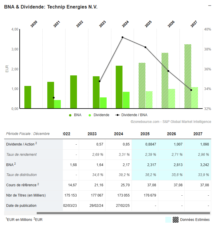 tandis que le taux de distribution reste prudent (≈35–39 %).