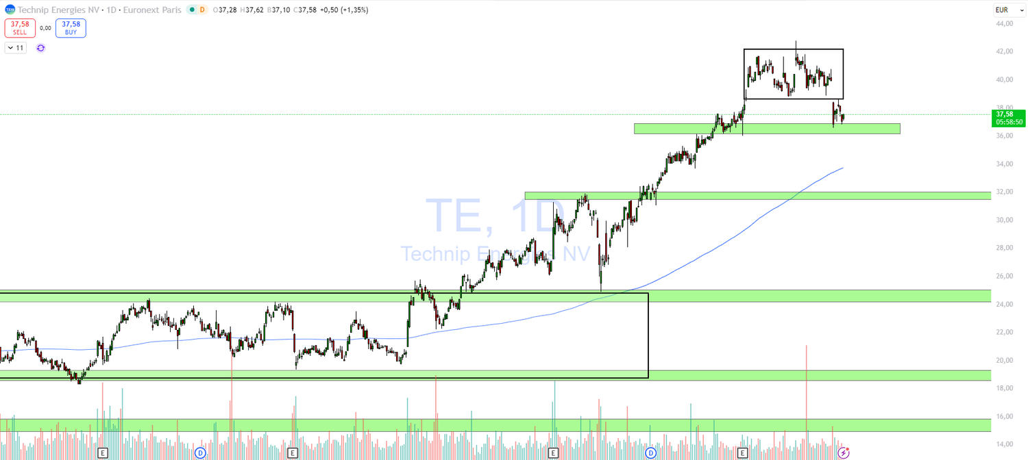 Le titre a formé une zone de congestion (range court terme) entre 40€ et 42€, avant de revenir tester un support horizontal important autour de 36,5€ – 37€.
