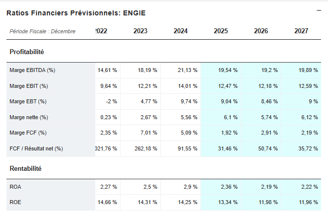 Le ROE grimpe progressivement vers 13 % à horizon 2027, presque au niveau d’Engie, mais avec une stabilité bien supérieure et une dépendance bien moindre aux conditions de marché.