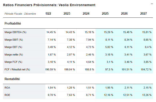 Les années 2023 et 2024 affichent des marges EBITDA supérieures à 18 %, et même au-delà de 19 % à partir de 2025 — un niveau remarquable pour une entreprise de services publics.