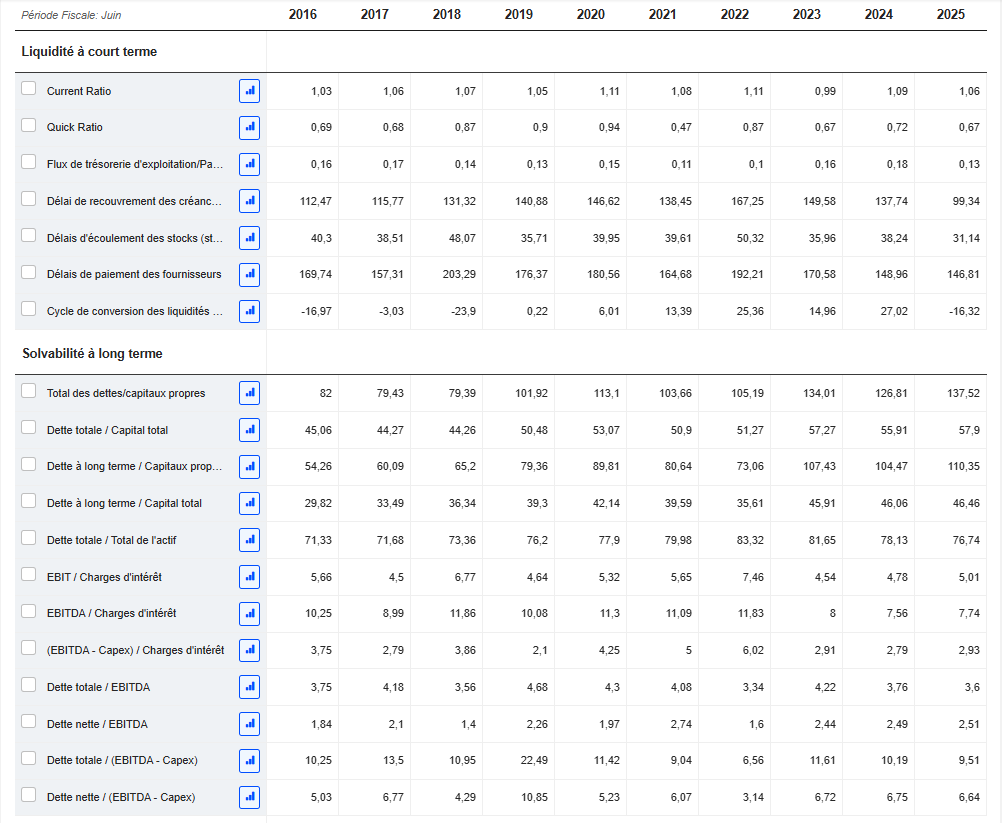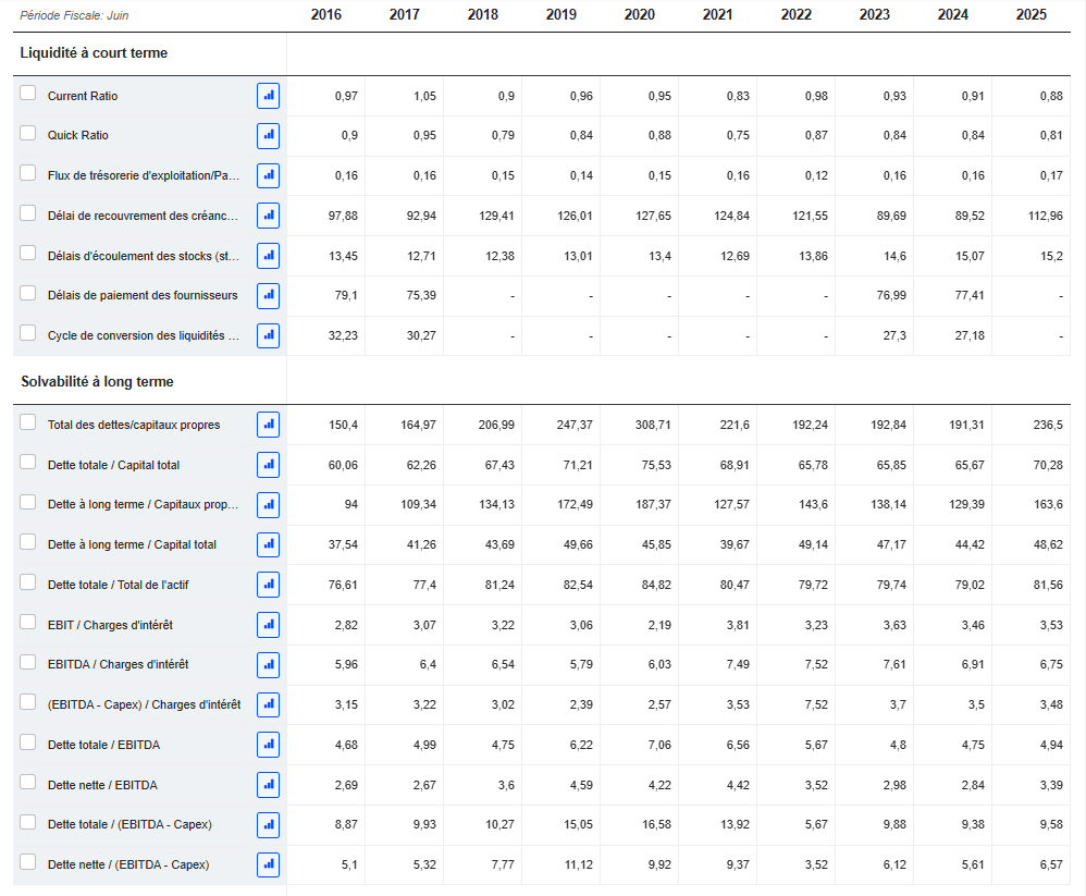 Côté solvabilité, les ratios restent sains : la dette totale représente environ 55 à 58 % du capital, et la couverture des intérêts (EBIT/charges d’intérêt autour de 5x) reste confortable.