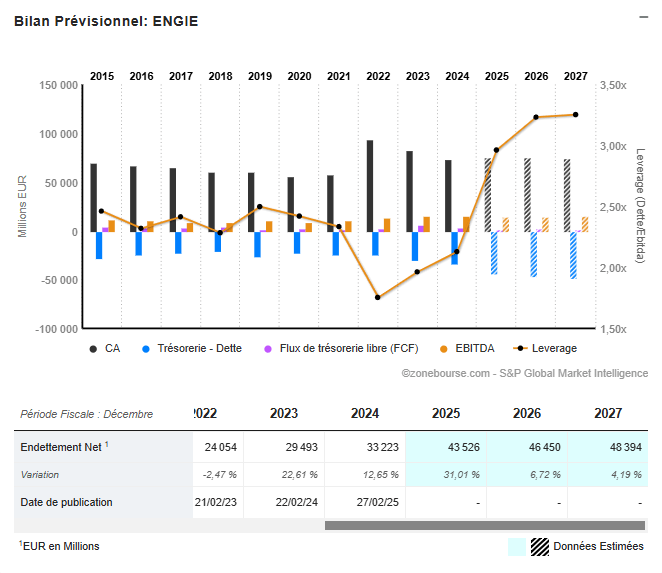 Chez Engie, les dernières années ont été marquées par une hausse progressive de l’endettement net, passée de 24 milliards d’euros en 2022 à plus de 33 milliards attendus en 2024, avant de grimper au-delà des 43 milliards dès 2025.