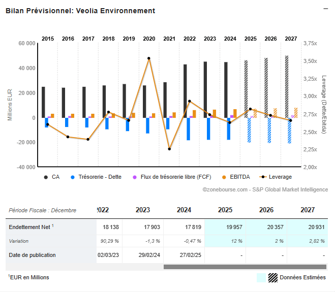 Veolia affiche une structure plus levierisée, mais d’une stabilité remarquable, soutenue par des flux réguliers et une visibilité contractuelle élevée.
